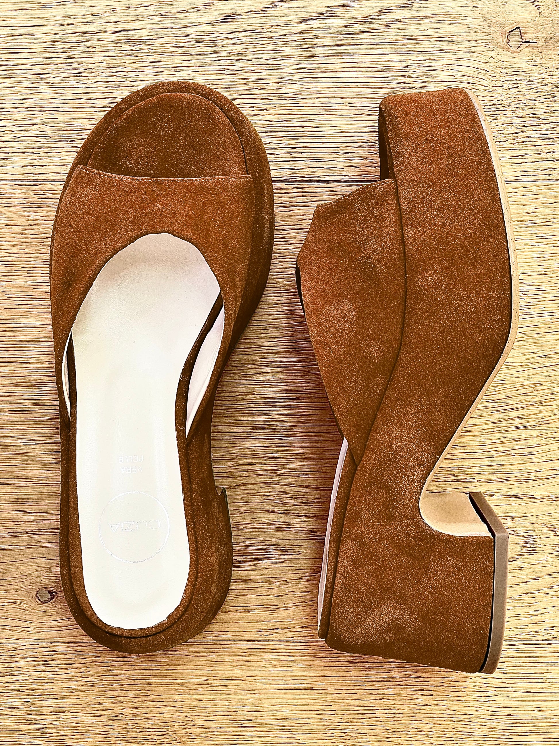 Sandale mules cu toc mediu.