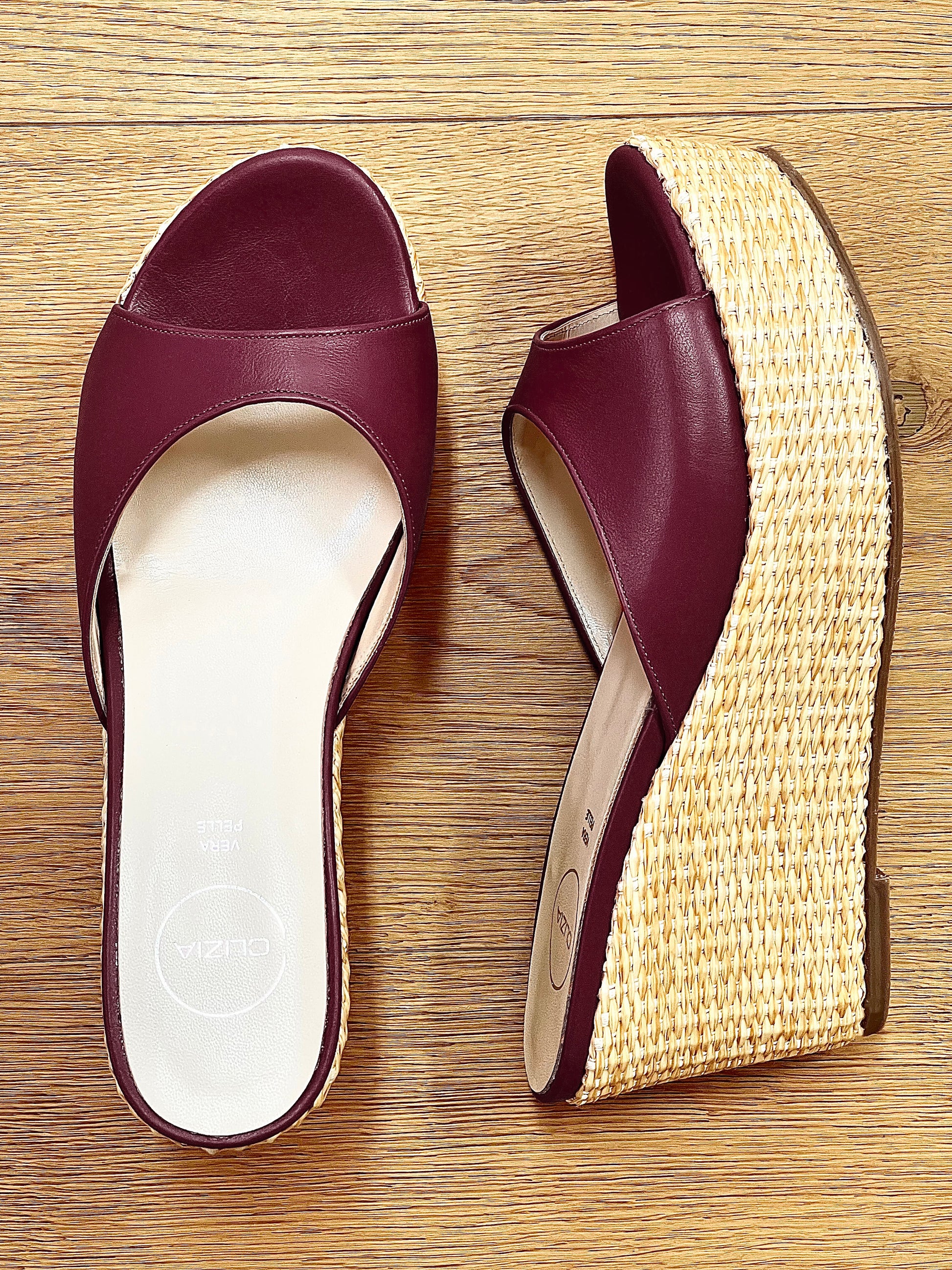 Sandale mules cu pană din rafie.