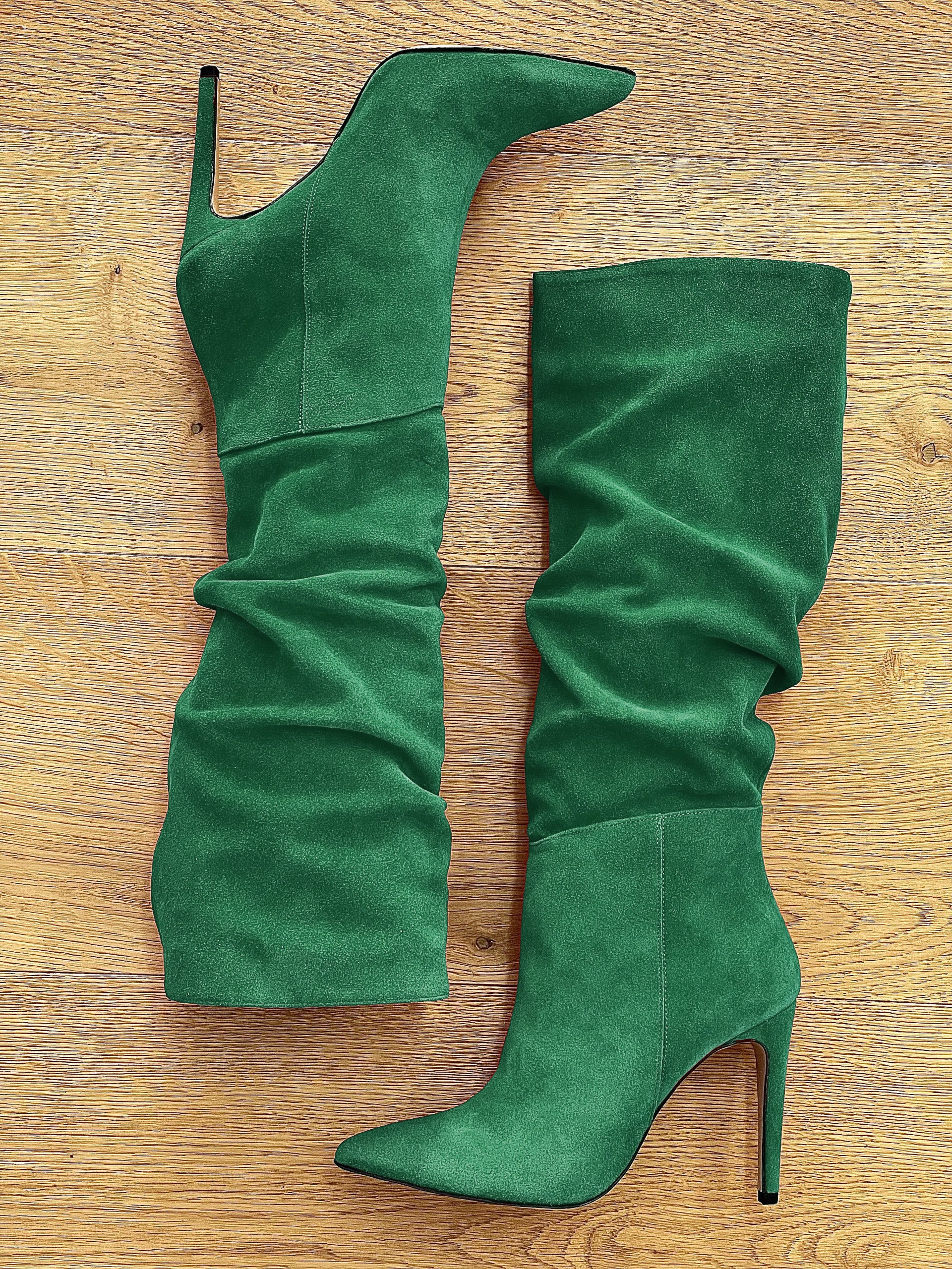 Stivali alti cascanti tubolari scamosciati tacco a spillo.