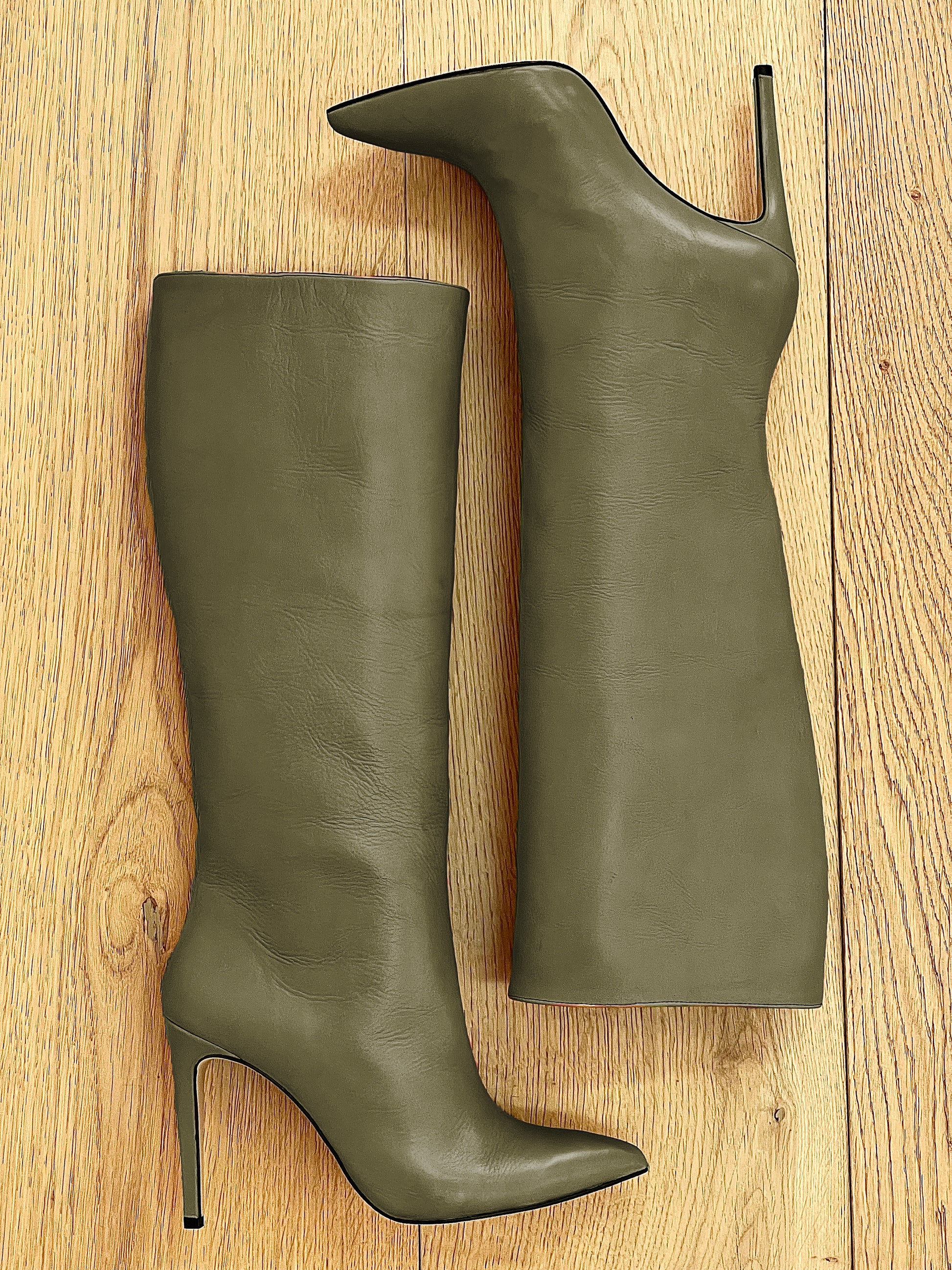 Stivali alti tubolari punta sfilata tacco spillo.