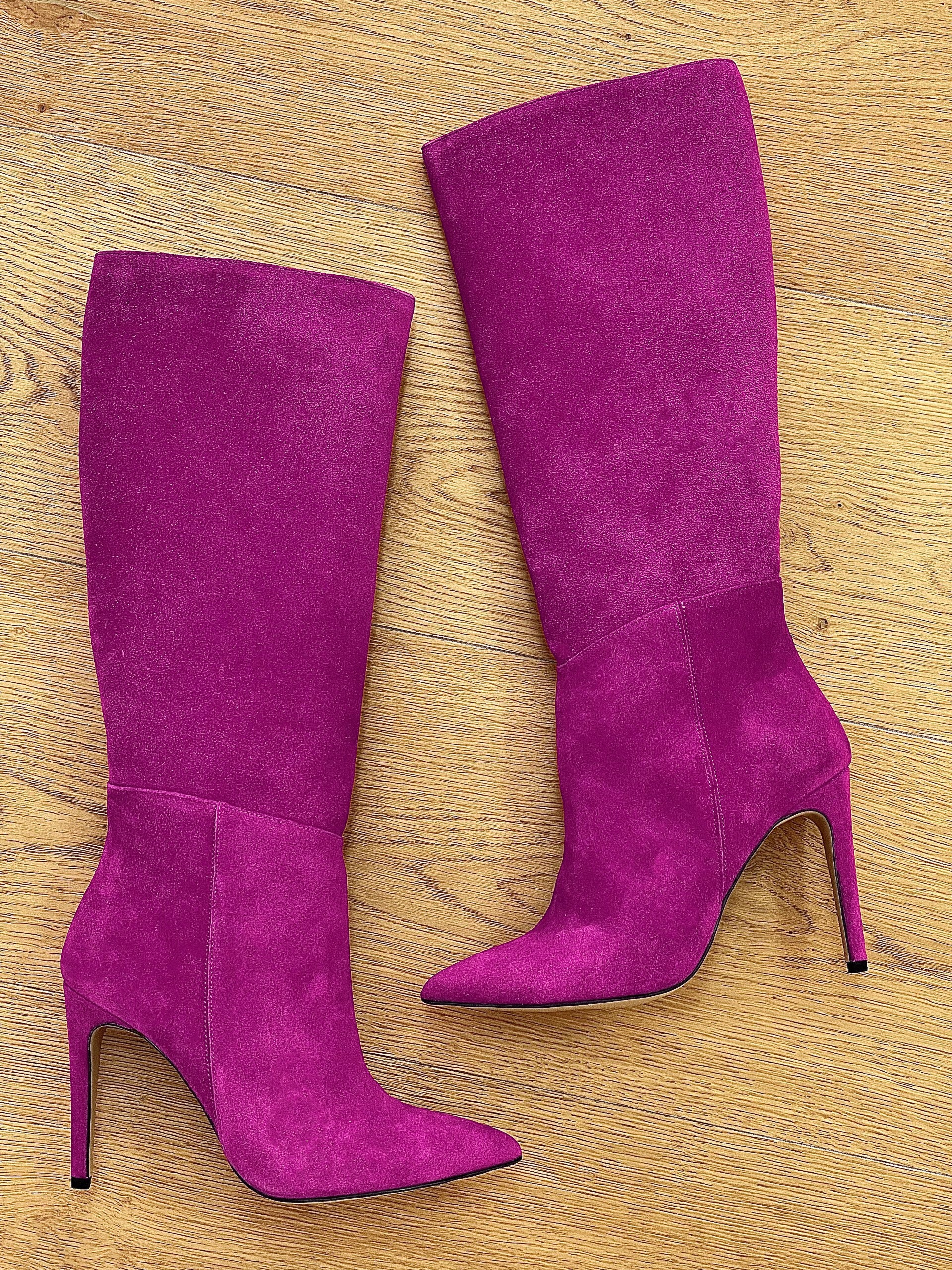 Stivali tubolari punta sfilata scamosciati tacco a spillo 10cm.